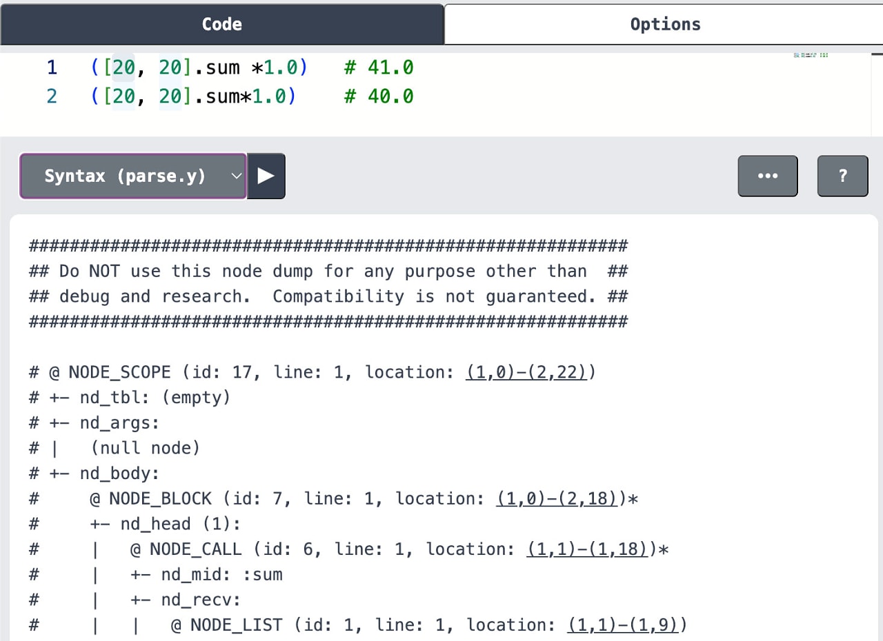 In Ruby Weekly #754 I shared a tip for using Reader Ufuk Kayserilioglu wrote in to remind me about the existence of the online Ruby Playground environment – a site that uses a WebAssembly-powered version of Ruby to run Ruby in the browser. It doesn't just run Ruby, though, it can also show the results of compiling code to Ruby bytecode, or the parse trees using both As such, you might find the Ruby Playground provides an even easier way to quickly check how Ruby parses a certain piece of Ruby code. Here's an example of the code from issue 754, also shown in the screenshot below: |