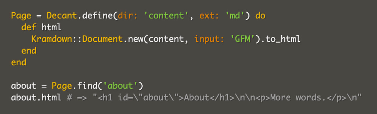 Decant: Framework-Agnostic, Frontmatter-Aware Wrapper for Static Content — One of those libraries you have to see in action to ‘get it’ but the idea is elegant and simple. Define a Decant class, point it to some typical static site content files, and it can help you bring them to life, such as in a tiny Sinatra app like this. Ben Pickles |